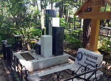 Так выглядело место захоронения на момент окончания работы: деревянный крест покрыт защитным раствором; мраморные изделия отшлифованы и покрыты гидрофобной субстанцией, стыки элементов промазаны белым герметиком; полые столбики, восстановлены; в цветнике заменена земля и посажен газон.